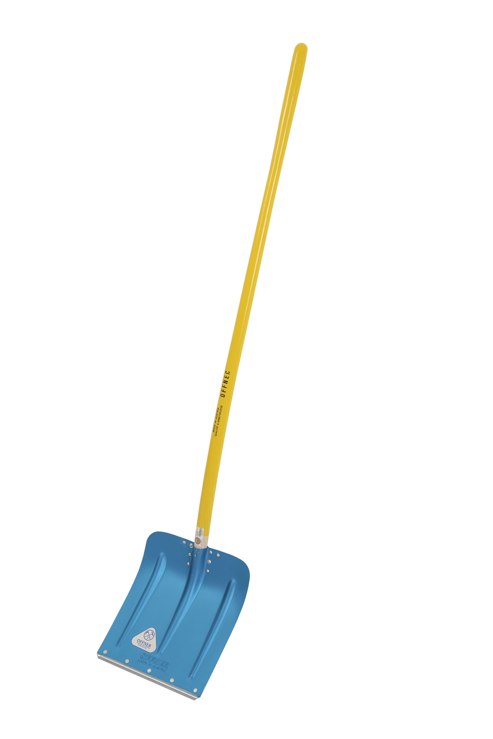 The Offner aluminium flat shovel size 1 with a yellow wooden handle is made from hardened aluminium and has a riveted steel edge. The shovel blade is anodised, is visually very attractive and has a coating that gives it a snow-repellent effect. The shovel has a curved wooden handle in striking yellow. The shovel blade, made from hardened aluminium, is reinforced with ribs and has a working width of 33 cm.