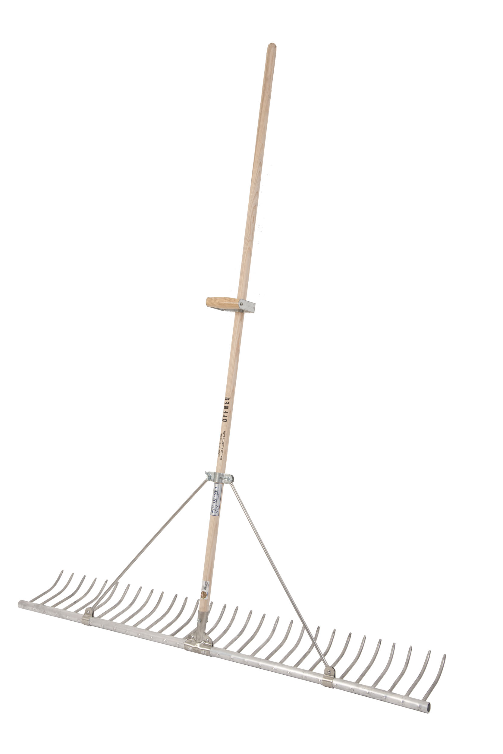 The OFFNER aluminium pulling rake has a 170 cm long wooden handle with additional wooden grip. The rake has a non-adjustable aluminium handle holder and 30 round prongs, which are curved to make harvesting hay as easy as possible. The prongs are firmly attached to the rake bar, and the large working width of 134 cm makes it ideal when efficiency is required.
