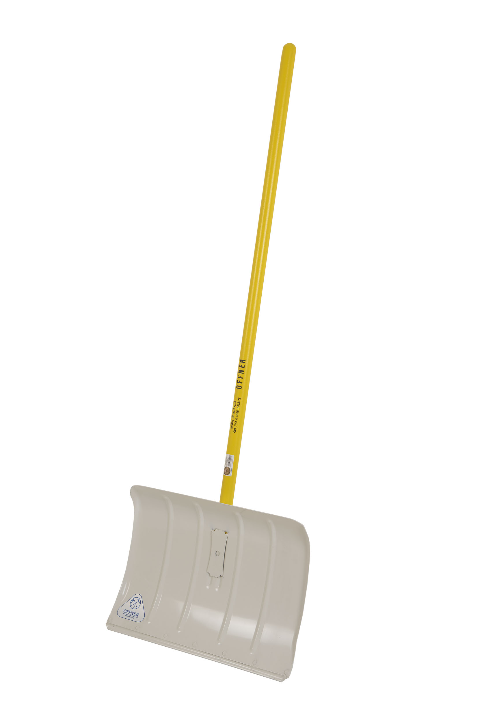 The Offner aluminium pusher has a ribbed, powder-coated blade and a 130 cm long wooden handle in striking yellow, which is attached to the blade with a metal clip.