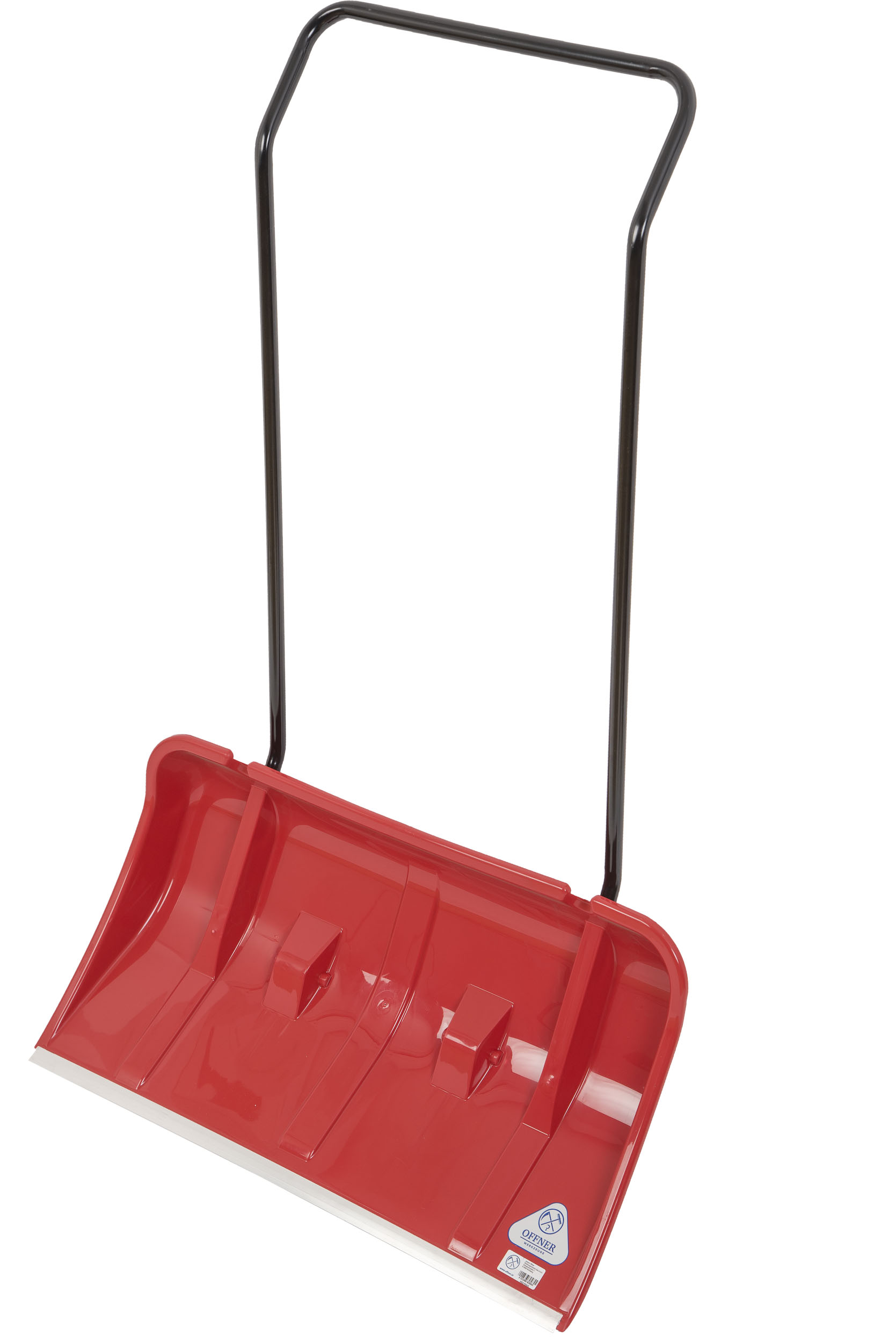 The Offner plastic snow collection tray with 2 wheels on the underside of the tray is made from robust, rigid plastic. The ergonomic handlebar makes it easy to remove even large quantities of snow with a minimum of effort. The aluminium profile edge gives the product very good rigidity. The raised edges prevent the snow to be cleared from falling out of the tray. Colour: red⁄black, snow tray blade: 43 x 80 cm