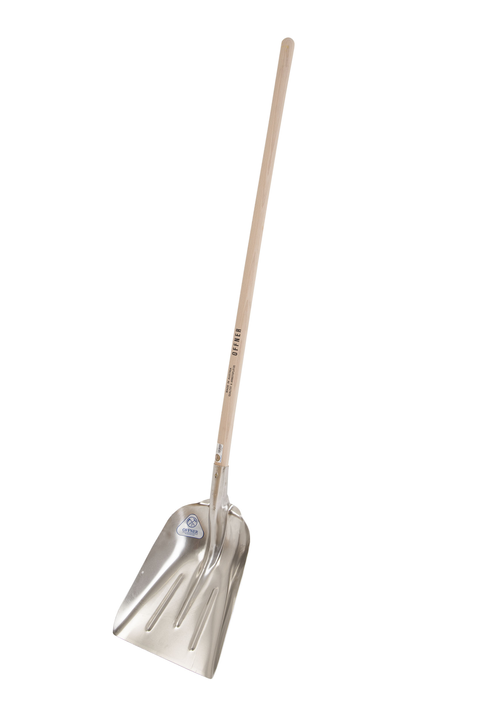 Die Offner Alu-Standardschaufel mit 130 cm gebogenem Hartholz-Stiel ist aus gehärtetem Aluminium. Das aus gehärtetem Aluminium hergestellte Schaufelblatt ist rippenverstärkt und hat eine Arbeitsbreite von 33 cm.