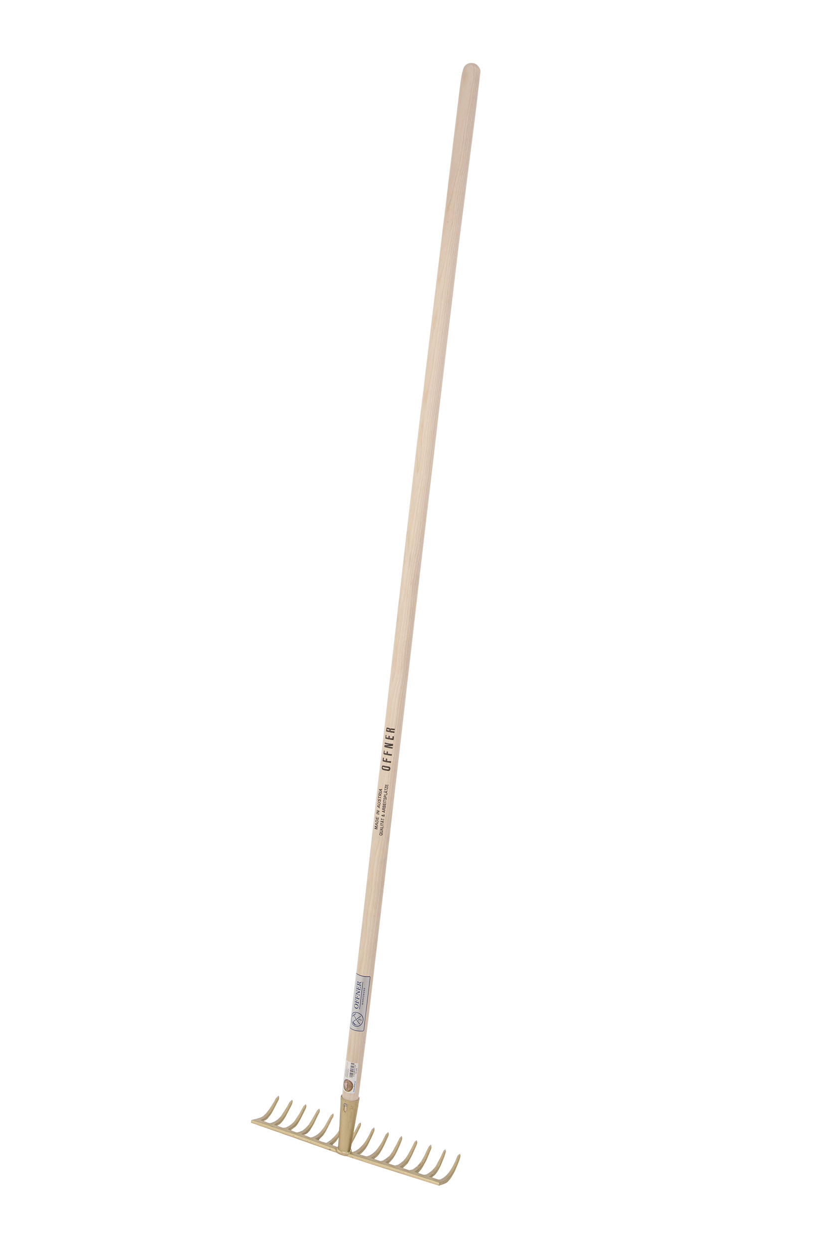 Der Offner Goldrechen mit 16 Zinken aus geschmiedetem Stahl hat einen 170 cm langen Holzstiel. Der sehr robuste Gartenrechen hat eine konische Dülle und eine Arbeitsbreite von 40 cm.