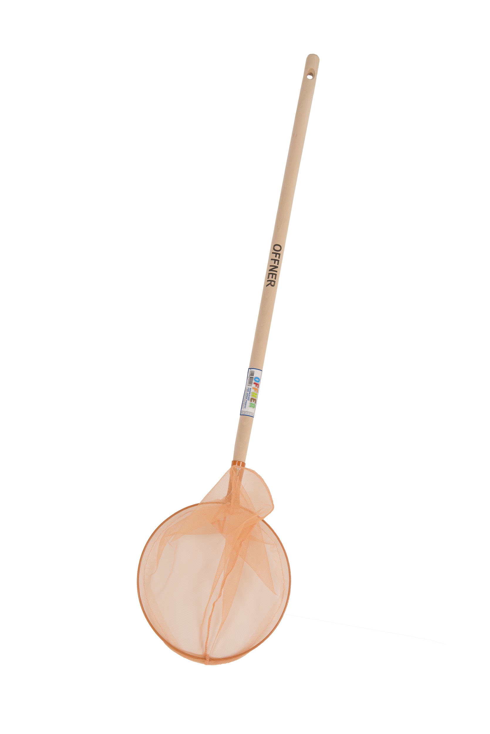 Der orange Offner Kinder-Fischkescher hat einen Durchmesser von 24 cm und ist mit einem 70 cm Holzstiel sowie einem bunten Kinder-Etikett ausgestattet.