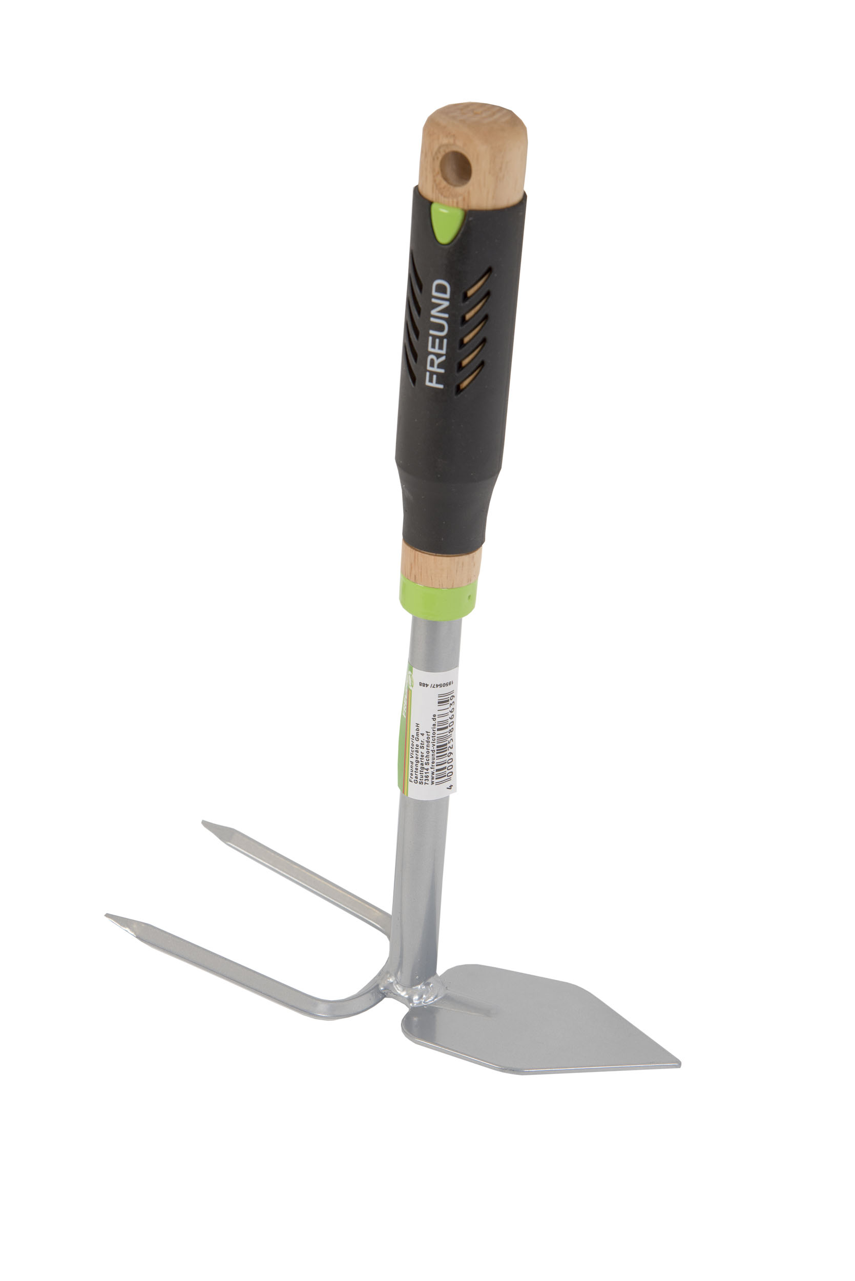 Das Freund Kleinhäckchen 488 aus Stahl ist pulverbeschichtet, hat einen Eichenholzgriff und besteht aus Zweizack und Herzform.