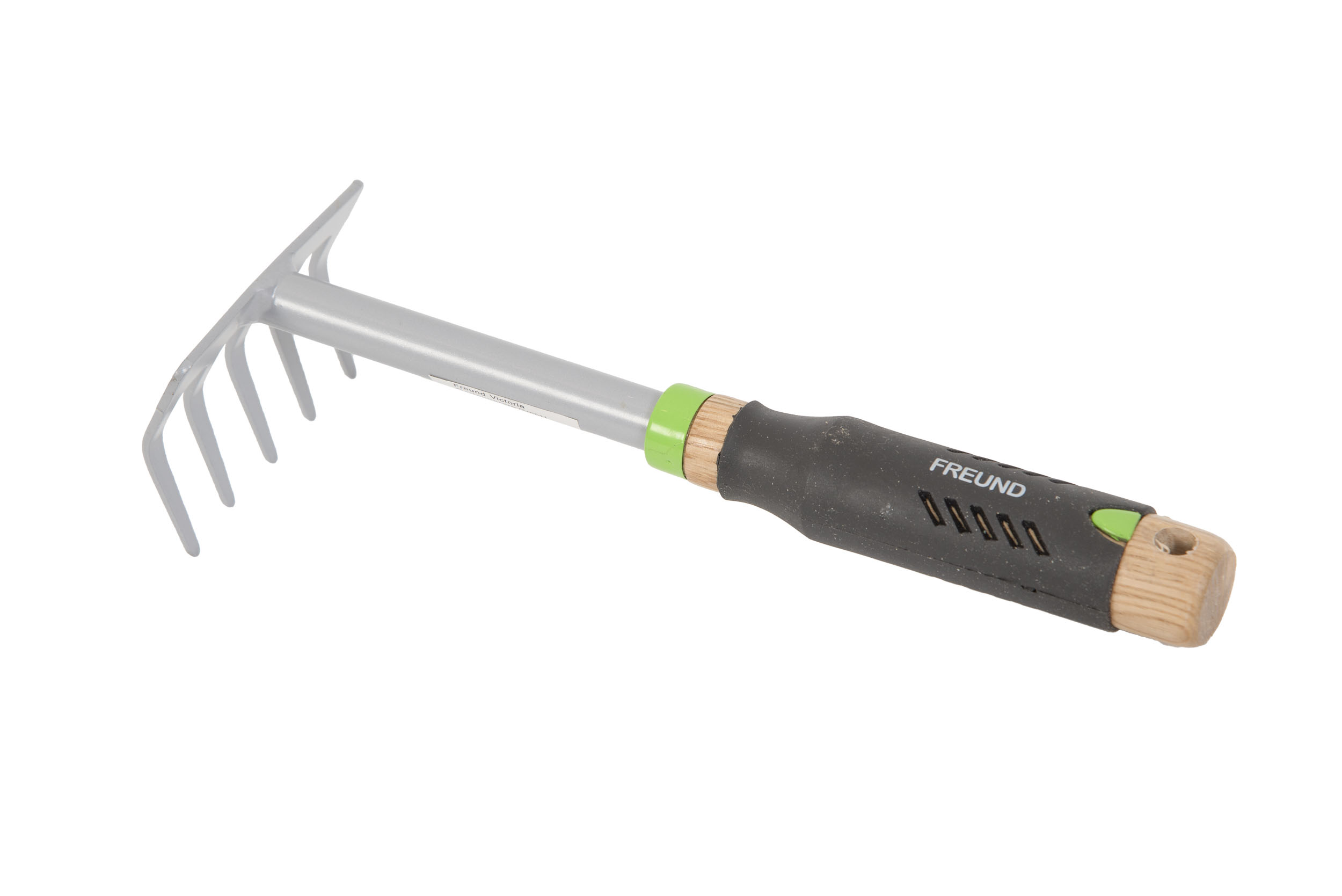 Der Freund Kleinrechen 485 aus Stahl ist pulverbeschichtet, hat einen Eichenholzgriff und 5 Zinken.
